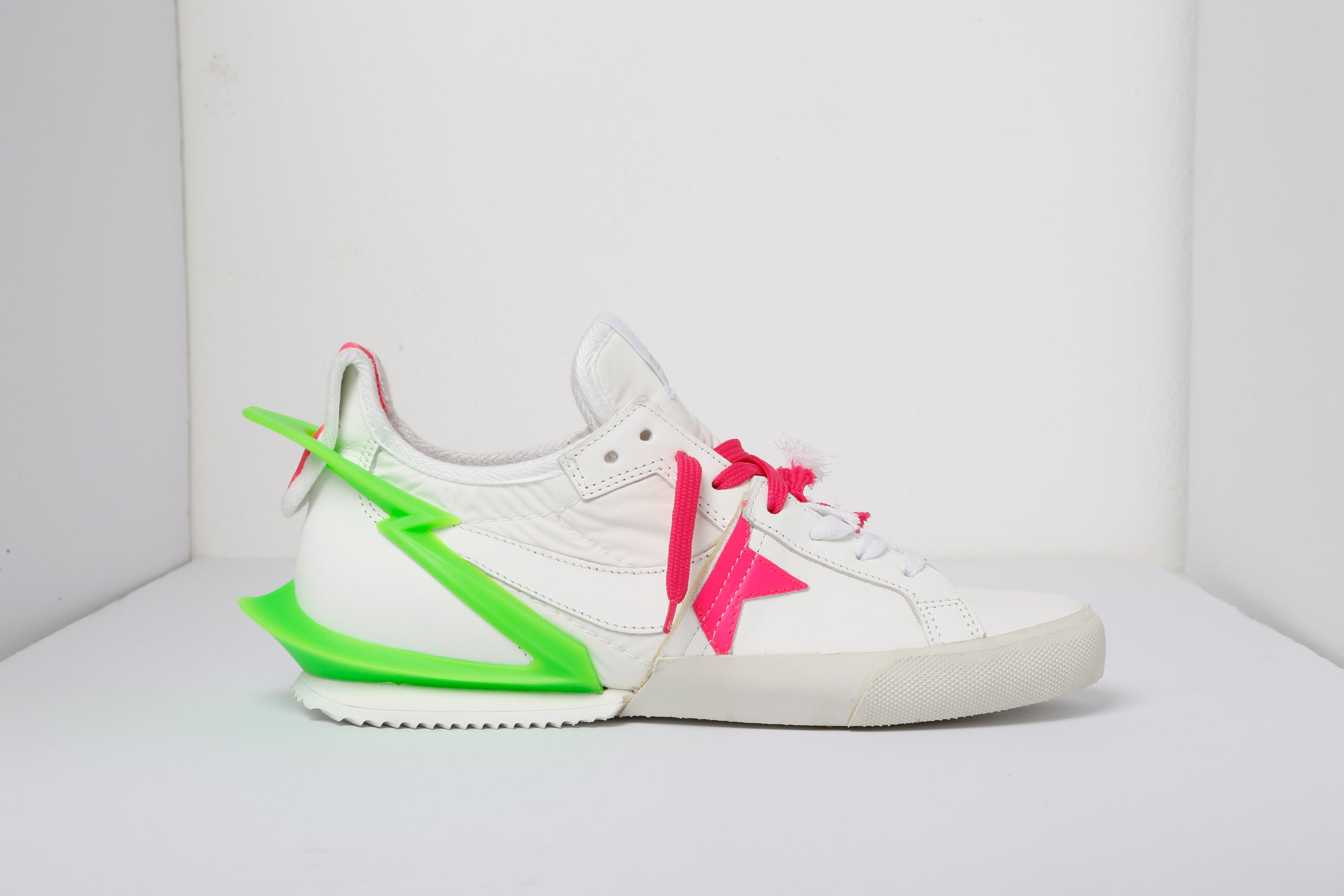 Introducing the LS005WF LIGHTING STAR - the ultimate combination of front Superstar design and Daybreak model back. Made from durable nylon and suede material, with a stabilizing black sole and eye-catching bicolor design. Elevate your style and performance with Lighting Star.